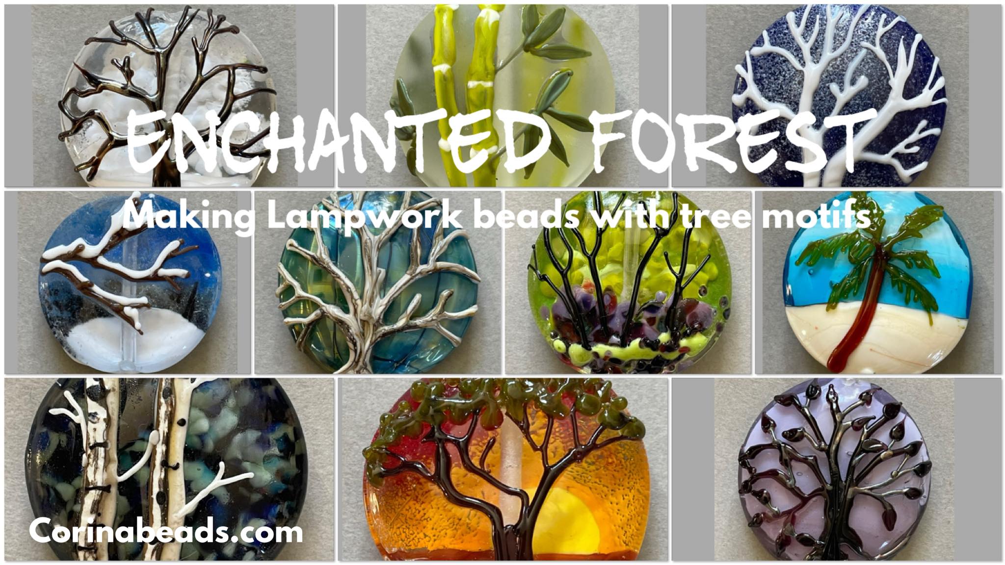 “Enchanted Forest “ is an exciting new class, both for beginners and advanced bead makers, that covers the topic of trees from all angles. Starting with the “generic tree”, trunks, branches and foliage, to a variety of specialty trees like birches, palm trees, African acacia trees and bamboo (yeah, I know, that’s technically not a tree, but it’s very cool)…apart from the trees themselves the class also dives into creating a visually interesting background that turns a mere tree into a small piece of art. bonus videos add knowledge about general techniques like making encased stringer, silvered ivory stringer or asking your own frit.
